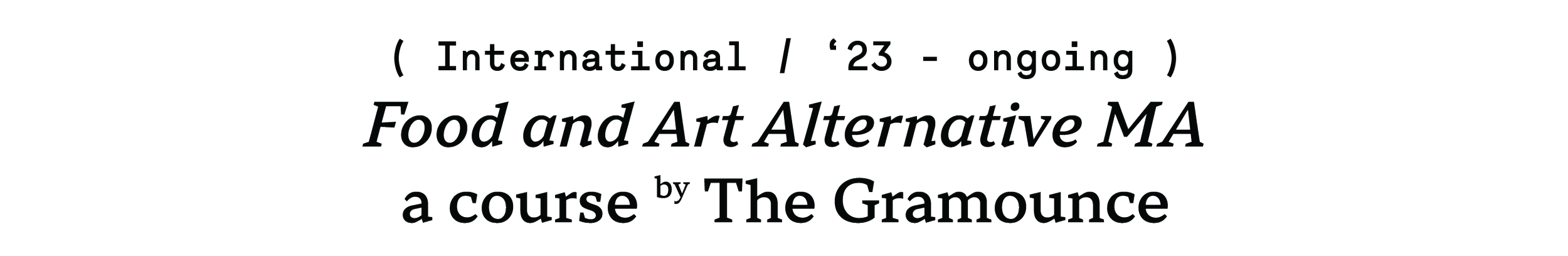 The Food and Art Alternative MA is a 2-year course focusing on food practices as political subjects in contemporary art and culture. We navigate the intersection of food histories, socially engaged art, political discourse and ecological understandings to critically explore contemporary tensions and possibilities through food. Departing from the lens of food, participants are encouraged to challenge inherited assumptions and biases by questioning the structures of power which control its production and distribution. In parallel, the course motivates speculation and alternative world-building through an artistic and research-based framework. Rooted in The Gramounce’s commitment to critical pedagogy, the altMA promotes peer-to-peer learning and interdisciplinary collaboration. The programme cultivates an educational space that resists hierarchical transmission in favour of shared inquiry, therefore aiming to decolonise both the curriculum and the applied learning and unlearning methodologies. Drawing from artistic and curatorial practices, gender studies, ecological thinking and a decolonial approach, the altMA aims to create a web of interconnected practices that allow for a plurality of voices, methodologies, and inquiries. The programme supports participants in mapping politically engaged food practices while developing their own situated methodologies. The programme combines in-house teaching that addresses foundational aspects of food and art, guest lectures from some of the most prominent minds in the field, residencies in collaboration with cutting-edge institutions, group discussions, one-to-one tutorials, and opportunities for public engagement. Participants have joined from over 50 countries, with diverse professional backgrounds (visual arts, anthropology, activism, cooking, farming, architecture, writing, among others), ages, and career stages. Some of our collaborators and speakers include ruangrupa, Yasmine Osendorf-Rodriguez, colectivo amasijo, Cooking Sections, Mediamatic, Delfina Foundation, Báyò Akómoláfé, Rain Wu, and Hicham Khalidi.